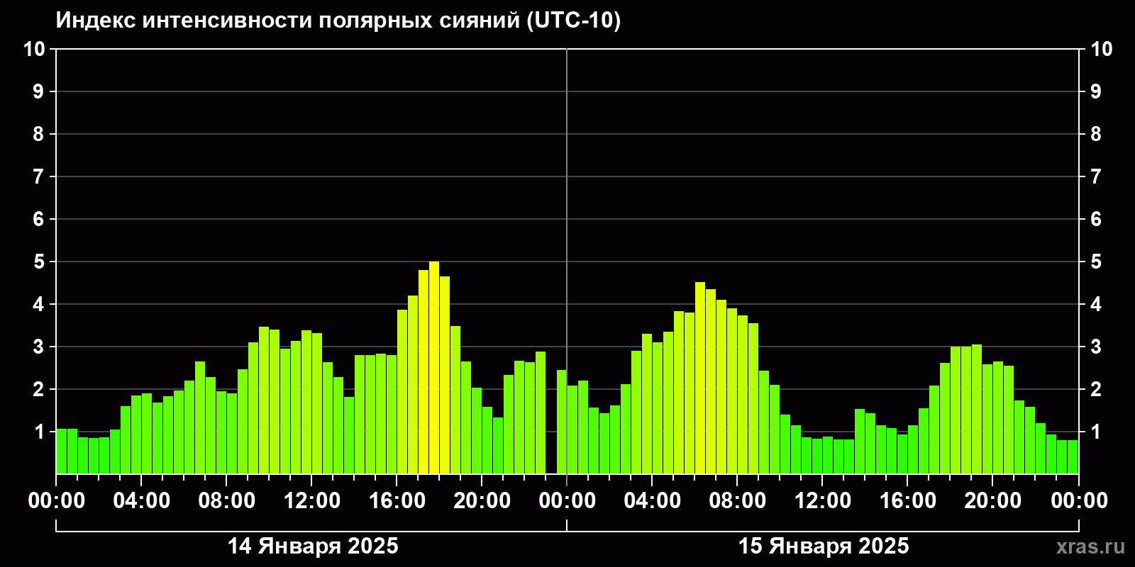 Изменения индекса интенсивности полярных сияний с 2025-01-14 по 2025-01-15 по местному времени