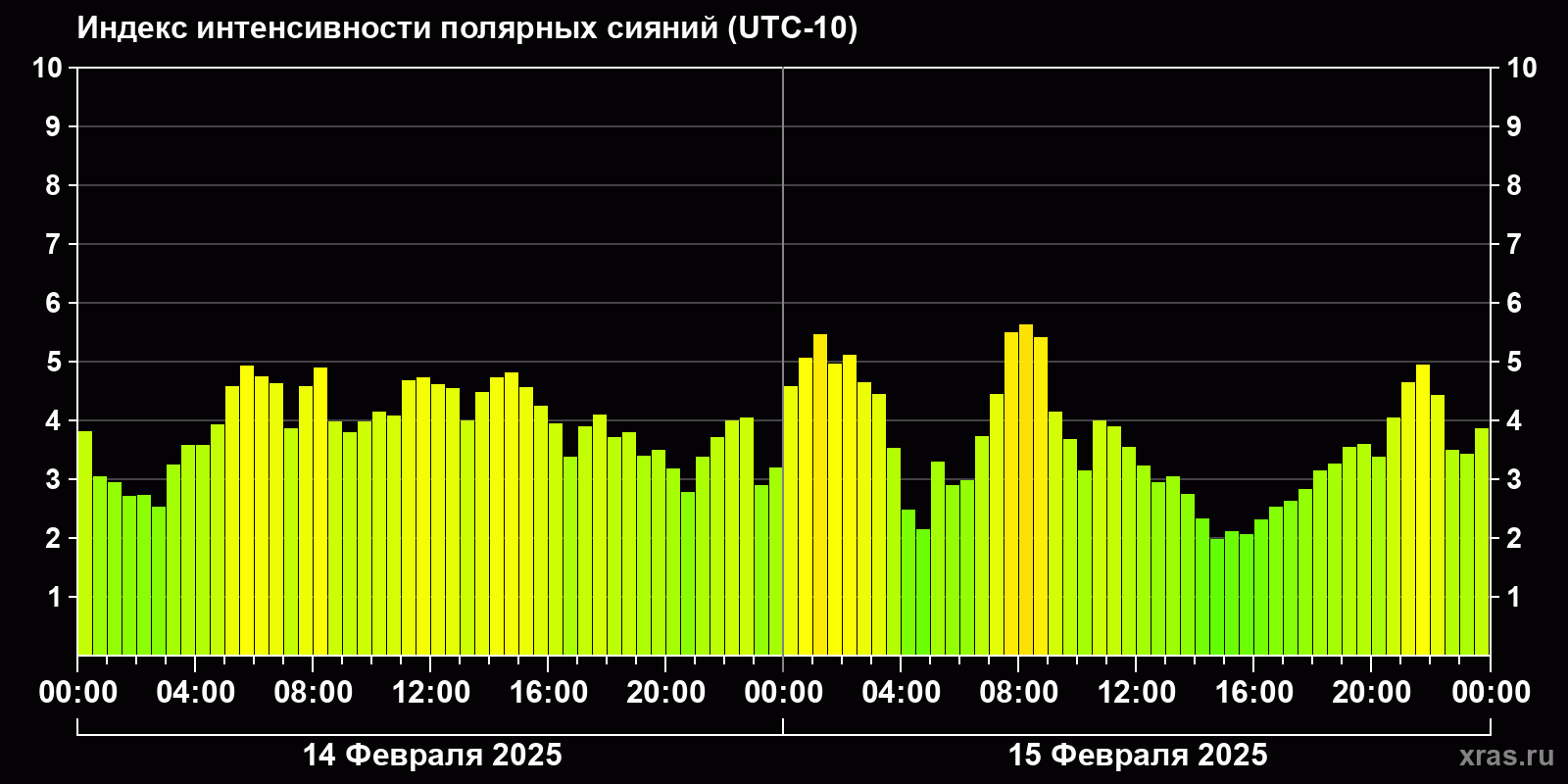 Изменения индекса интенсивности полярных сияний с 2025-02-14 по 2025-02-15 по местному времени