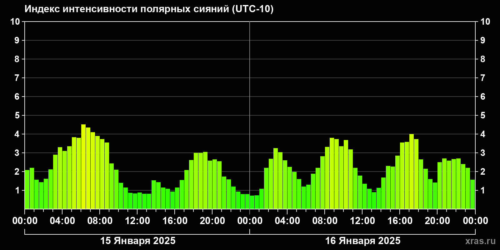 Изменения индекса интенсивности полярных сияний с 2025-01-15 по 2025-01-16 по местному времени