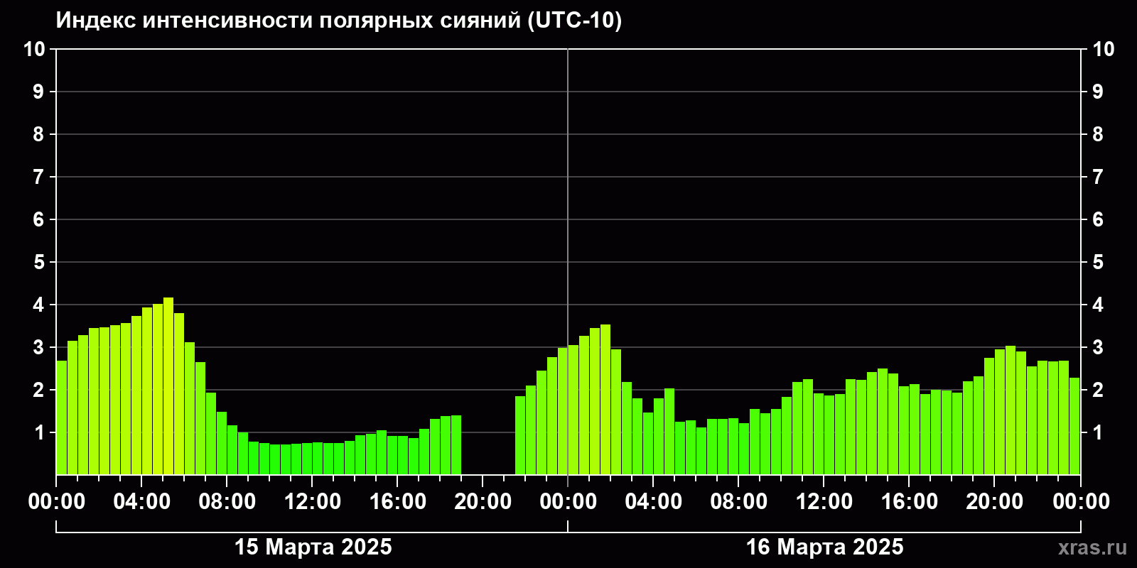 Изменения индекса интенсивности полярных сияний с 2025-03-15 по 2025-03-16 по местному времени