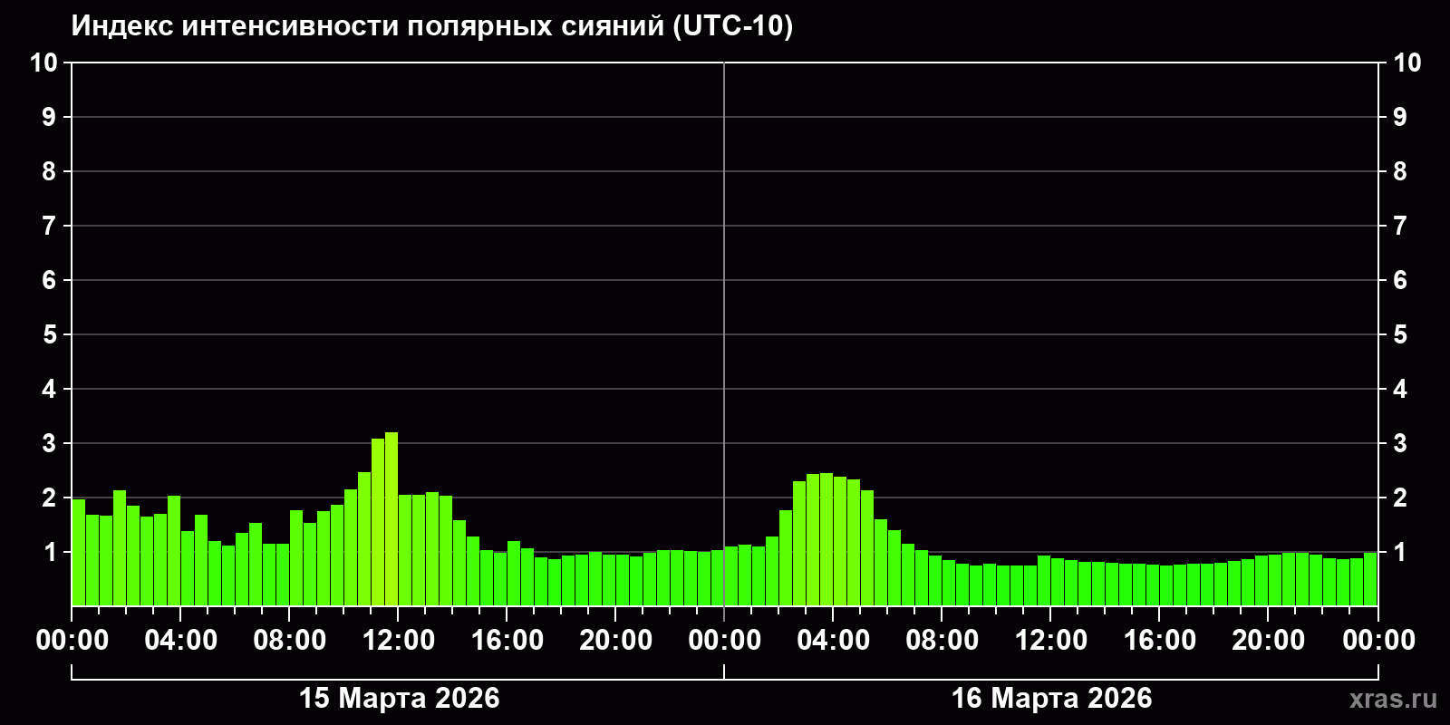 Изменения индекса интенсивности полярных сияний с 2026-03-15 по 2026-03-16 по местному времени