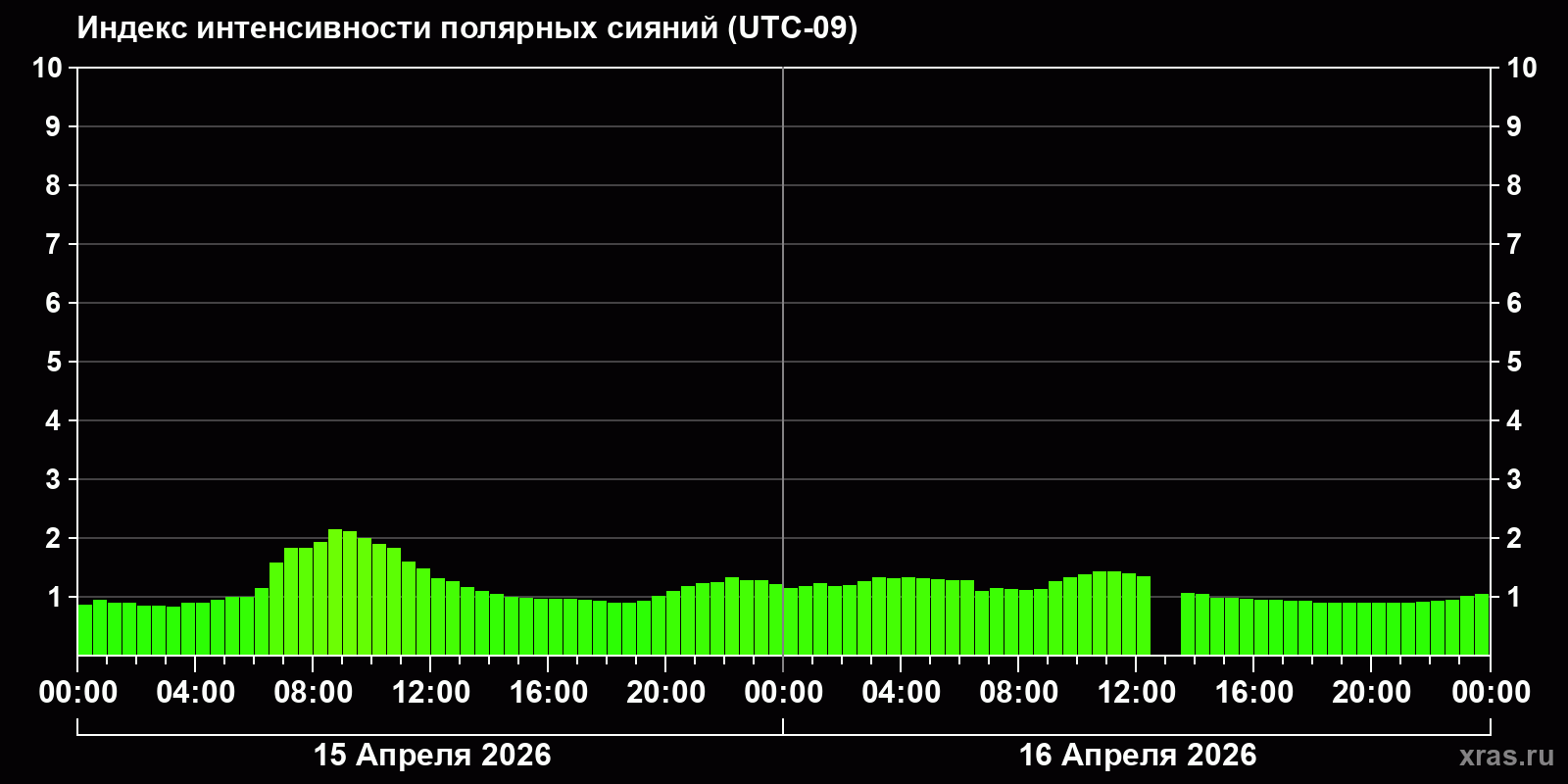 Изменения индекса интенсивности полярных сияний с 2026-04-15 по 2026-04-16 по местному времени
