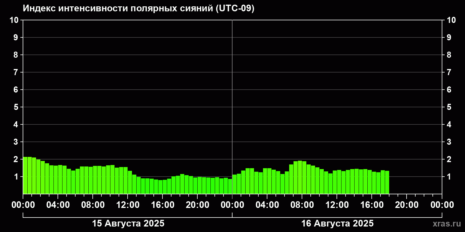 Изменения индекса интенсивности полярных сияний с 2025-08-15 по 2025-08-16 по местному времени