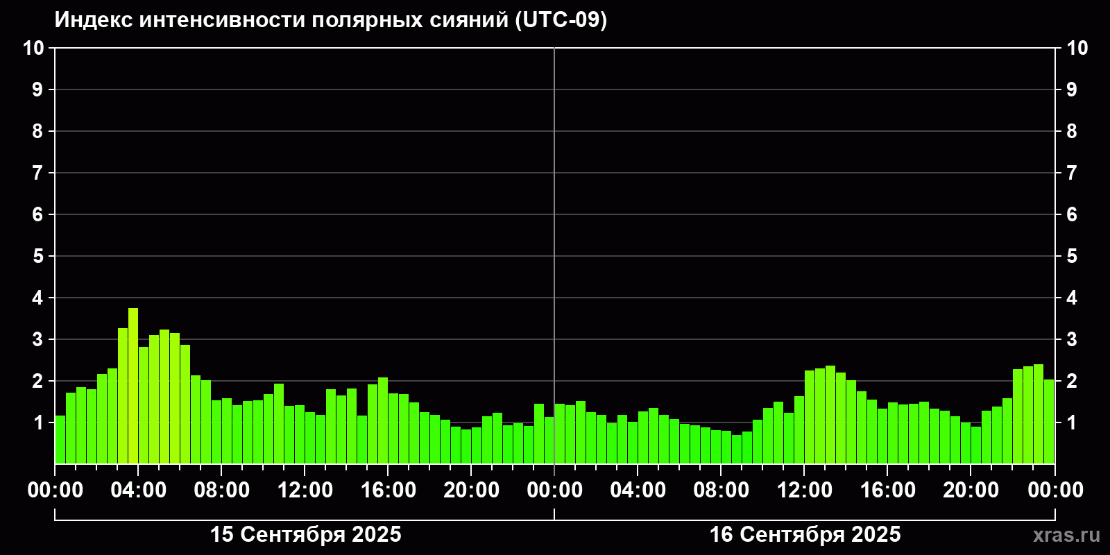 Изменения индекса интенсивности полярных сияний с 2025-09-15 по 2025-09-16 по местному времени