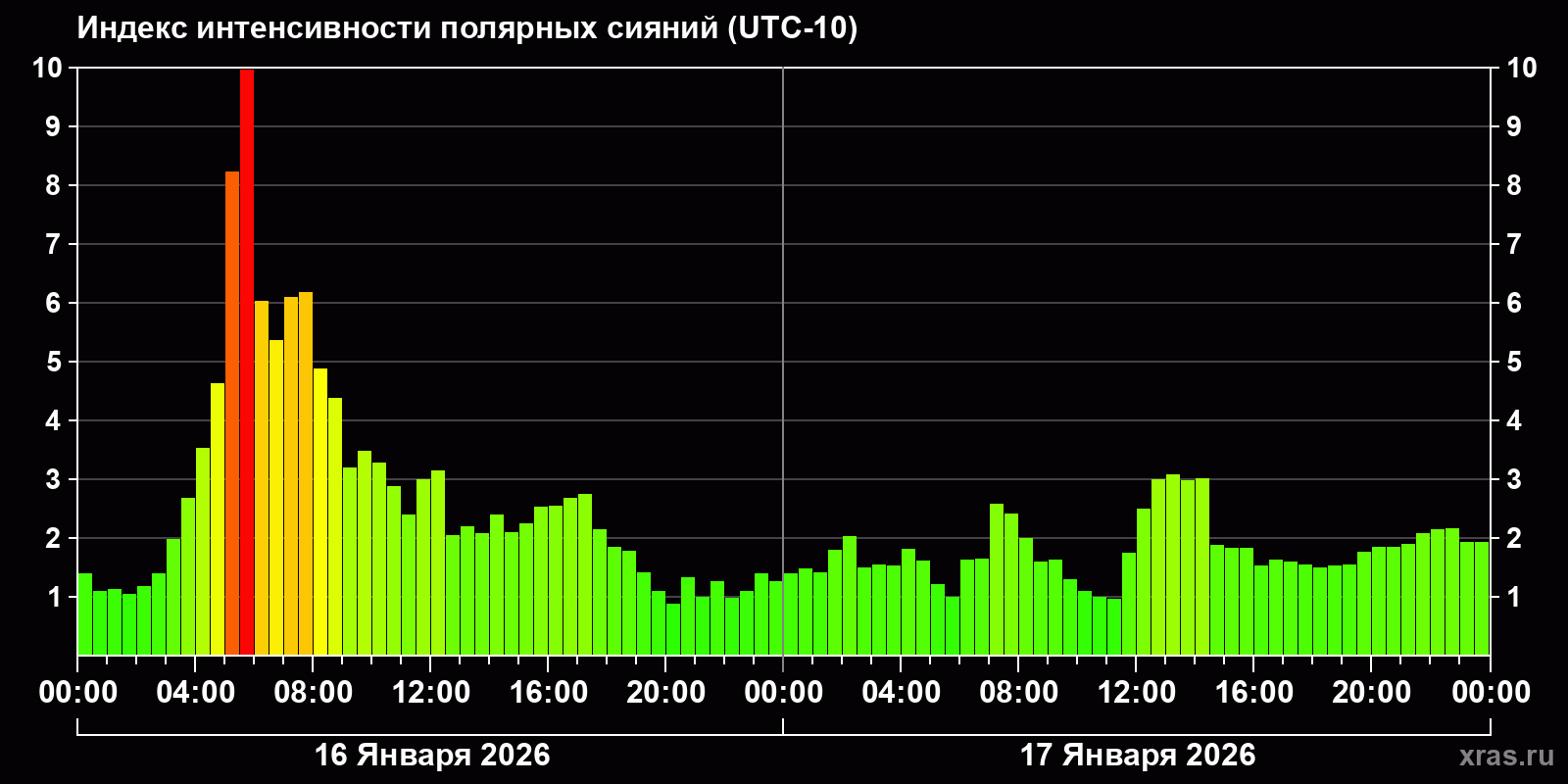 Изменения индекса интенсивности полярных сияний с 2026-01-16 по 2026-01-17 по местному времени