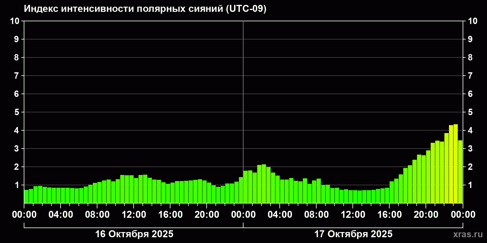 Изменения индекса интенсивности полярных сияний с 2025-10-16 по 2025-10-17 по местному времени