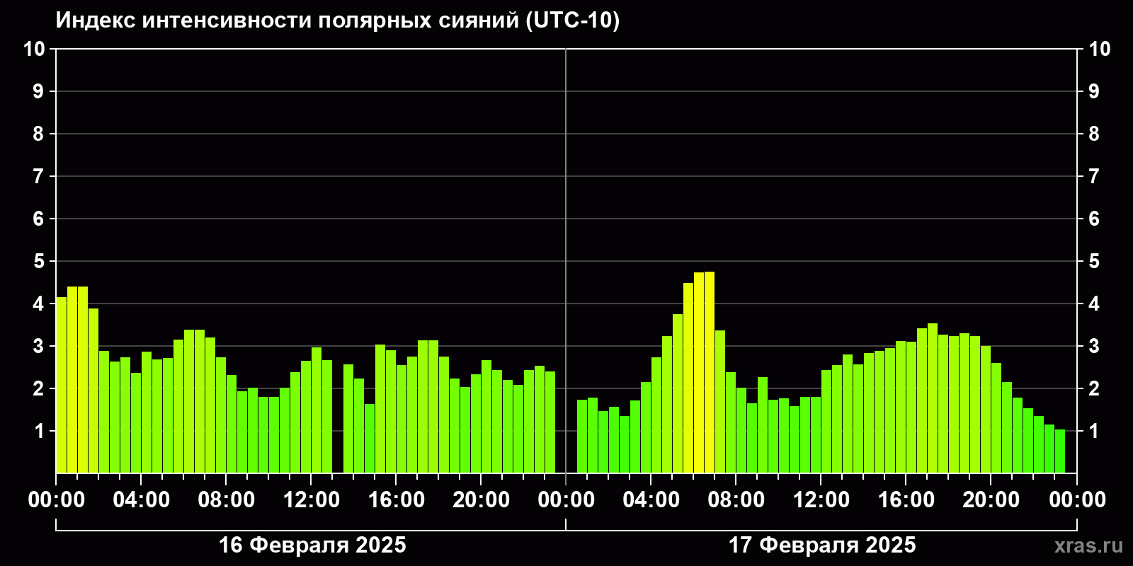 Изменения индекса интенсивности полярных сияний с 2025-02-16 по 2025-02-17 по местному времени