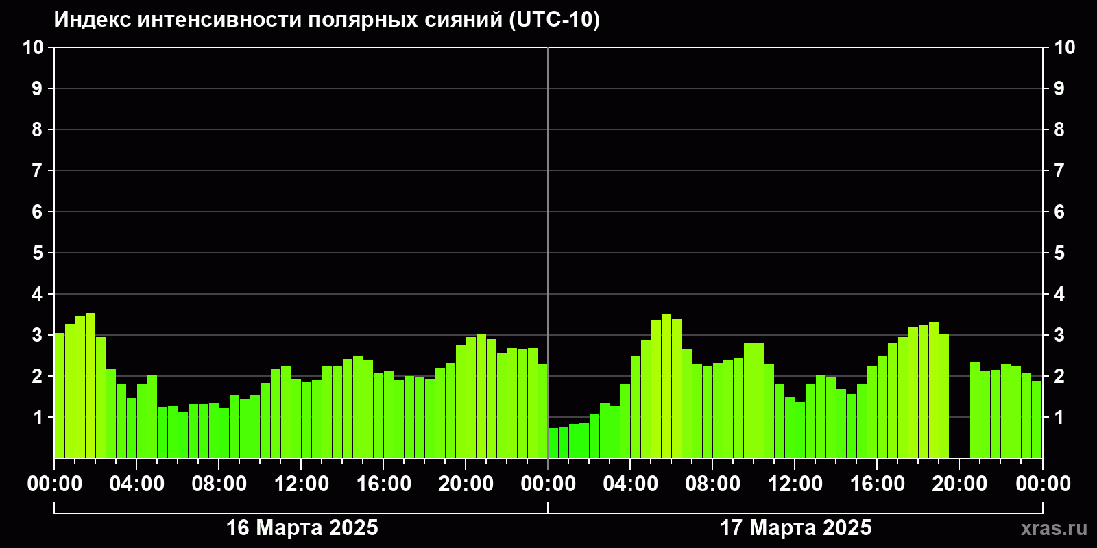 Изменения индекса интенсивности полярных сияний с 2025-03-16 по 2025-03-17 по местному времени
