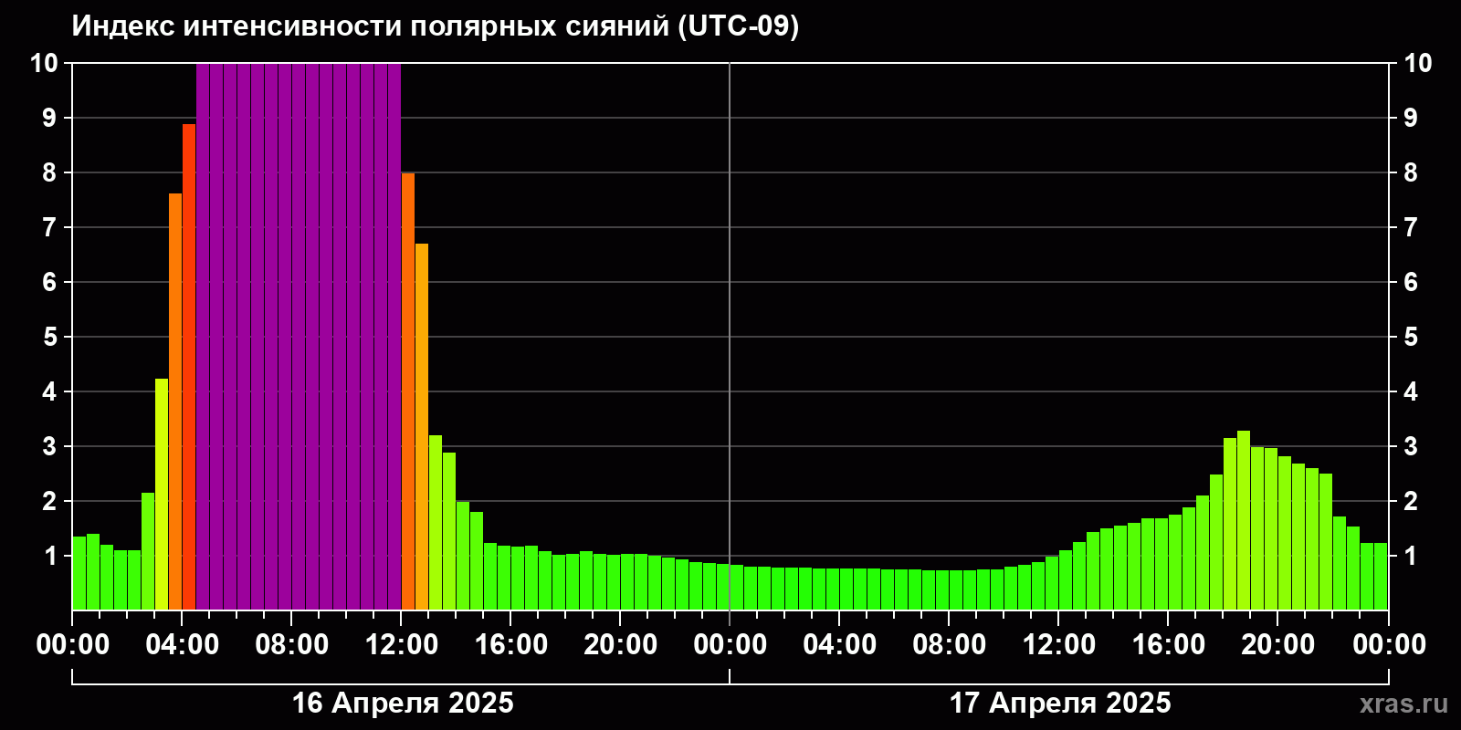 Изменения индекса интенсивности полярных сияний с 2025-04-16 по 2025-04-17 по местному времени