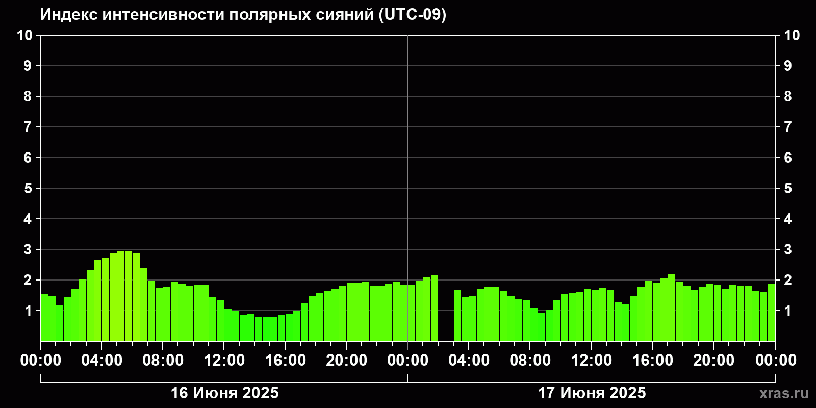 Изменения индекса интенсивности полярных сияний с 2025-06-16 по 2025-06-17 по местному времени