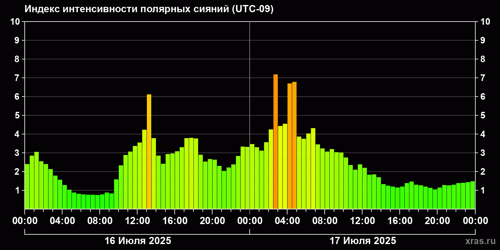Изменения индекса интенсивности полярных сияний с 2025-07-16 по 2025-07-17 по местному времени