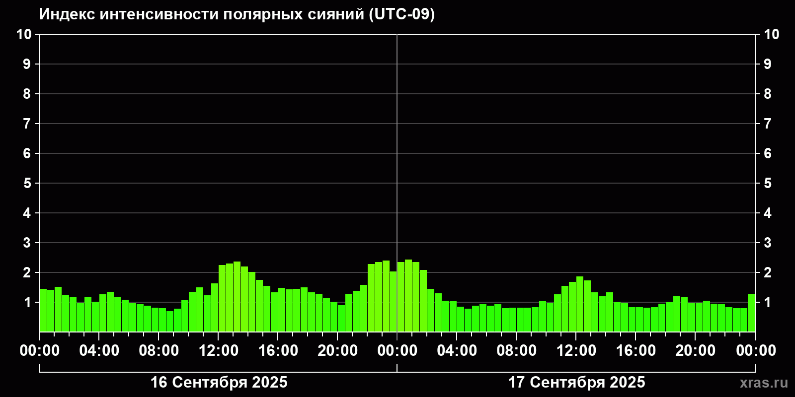 Изменения индекса интенсивности полярных сияний с 2025-09-16 по 2025-09-17 по местному времени