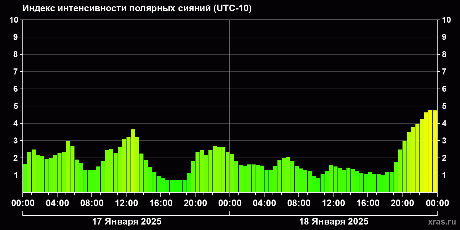 Изменения индекса интенсивности полярных сияний с 2025-01-17 по 2025-01-18 по местному времени
