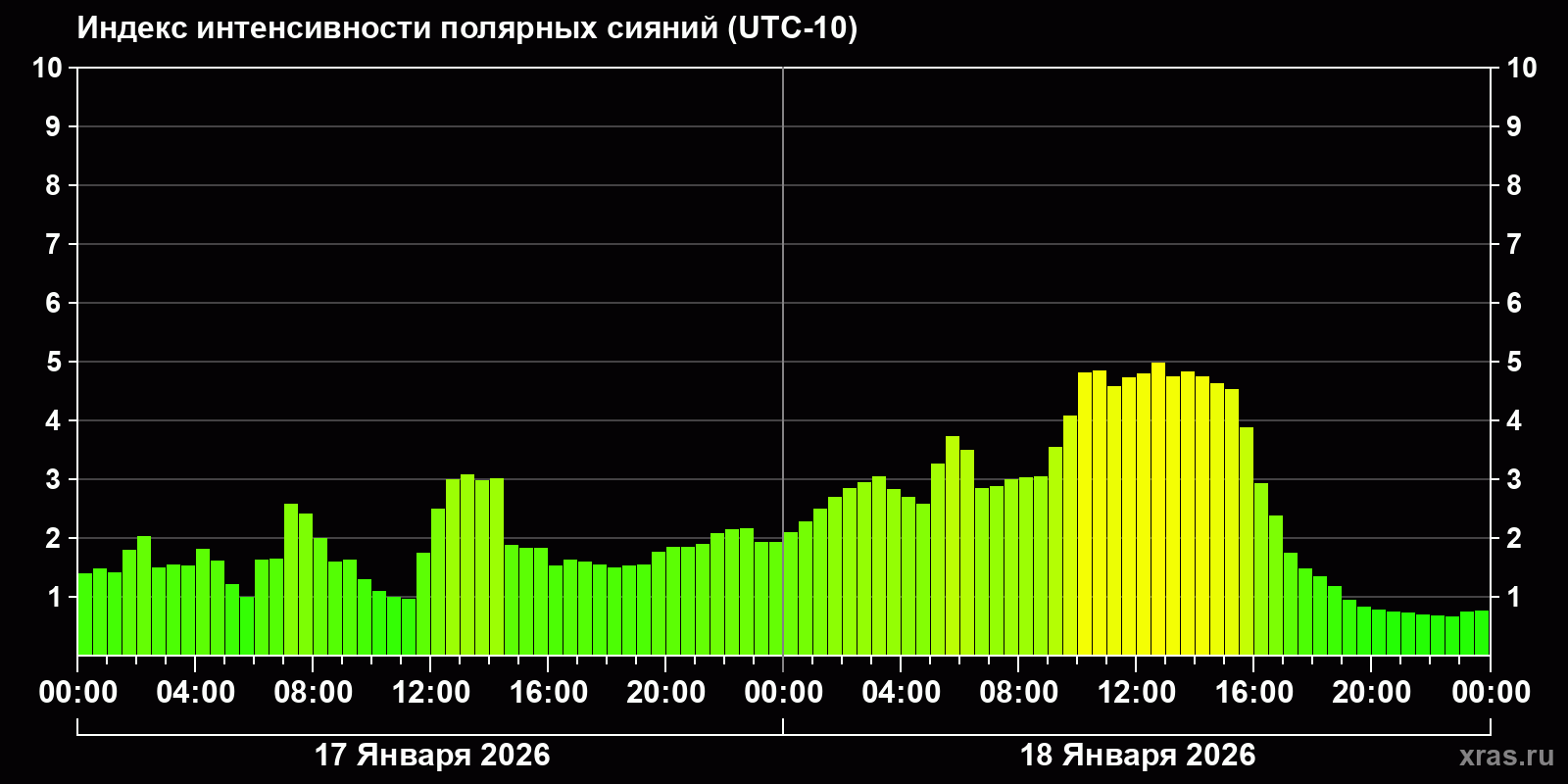 Изменения индекса интенсивности полярных сияний с 2026-01-17 по 2026-01-18 по местному времени