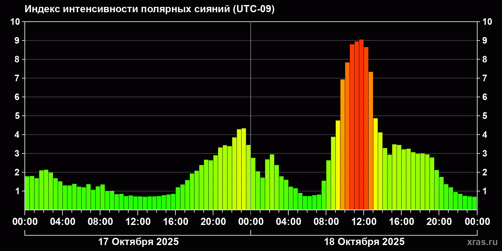 Изменения индекса интенсивности полярных сияний с 2025-10-17 по 2025-10-18 по местному времени