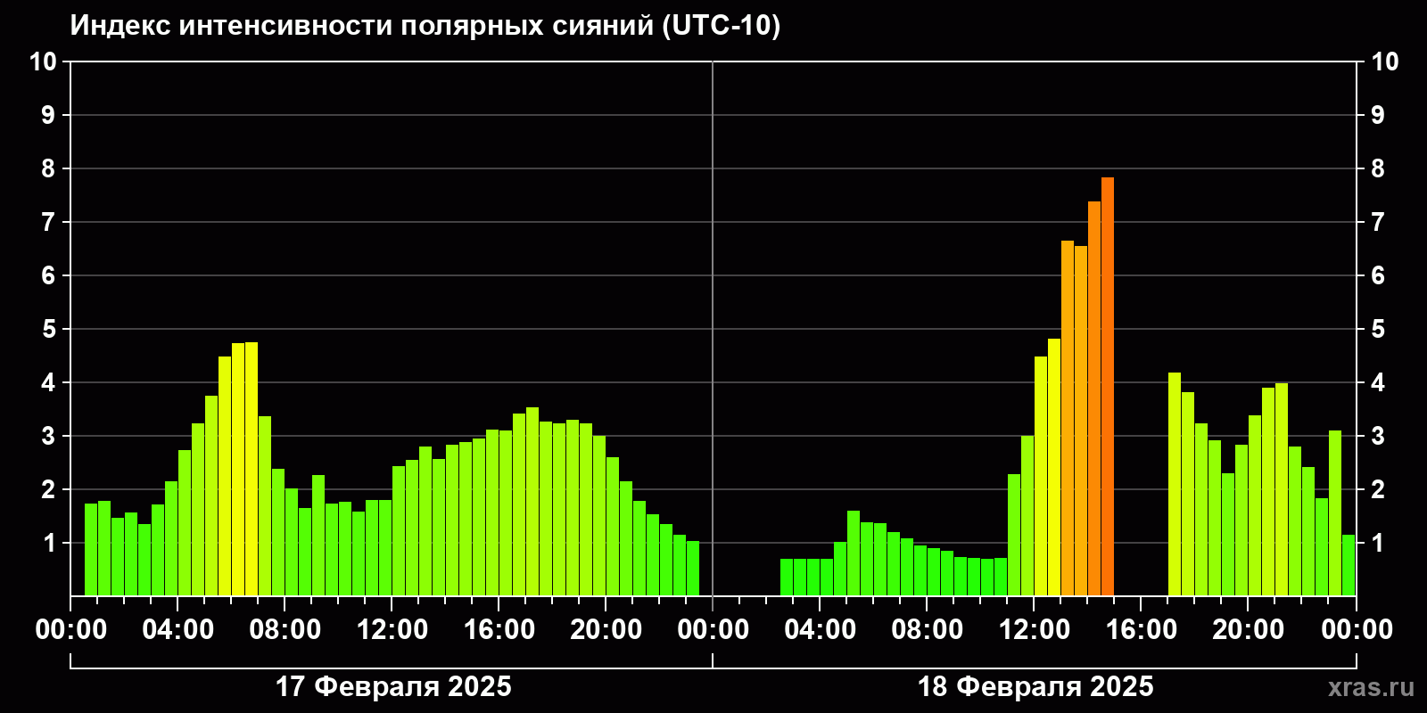Изменения индекса интенсивности полярных сияний с 2025-02-17 по 2025-02-18 по местному времени