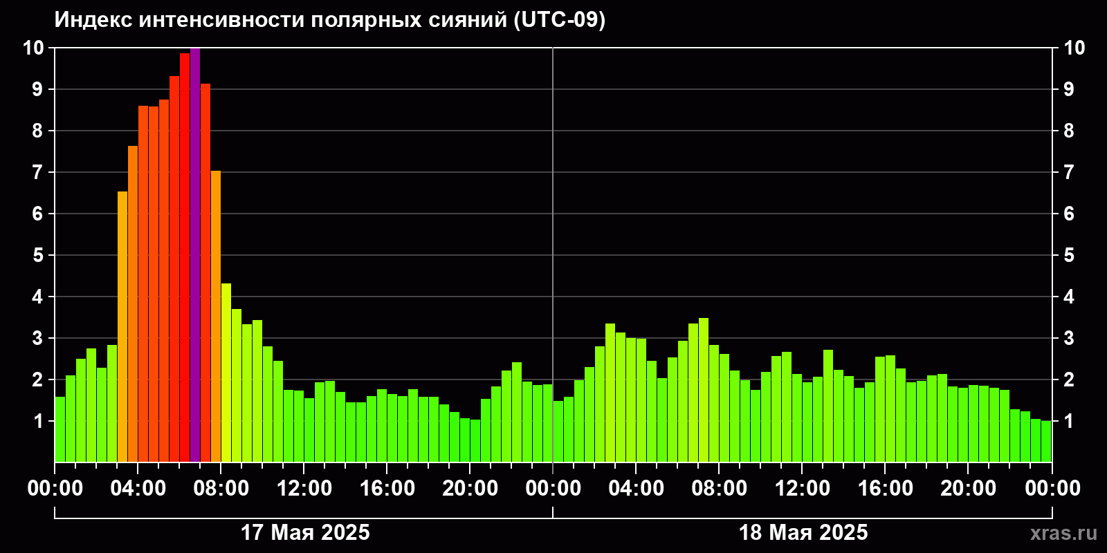 Изменения индекса интенсивности полярных сияний с 2025-05-17 по 2025-05-18 по местному времени