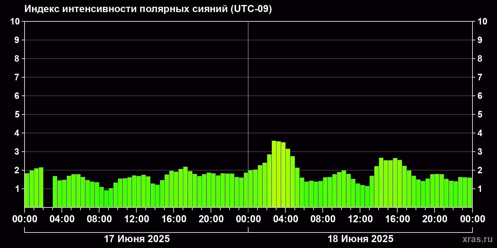 Изменения индекса интенсивности полярных сияний с 2025-06-17 по 2025-06-18 по местному времени