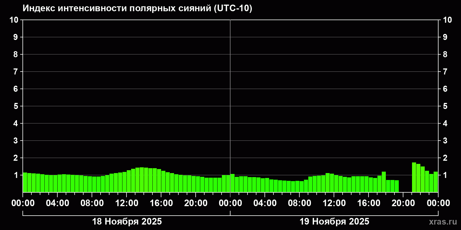Изменения индекса интенсивности полярных сияний с 2025-11-18 по 2025-11-19 по местному времени