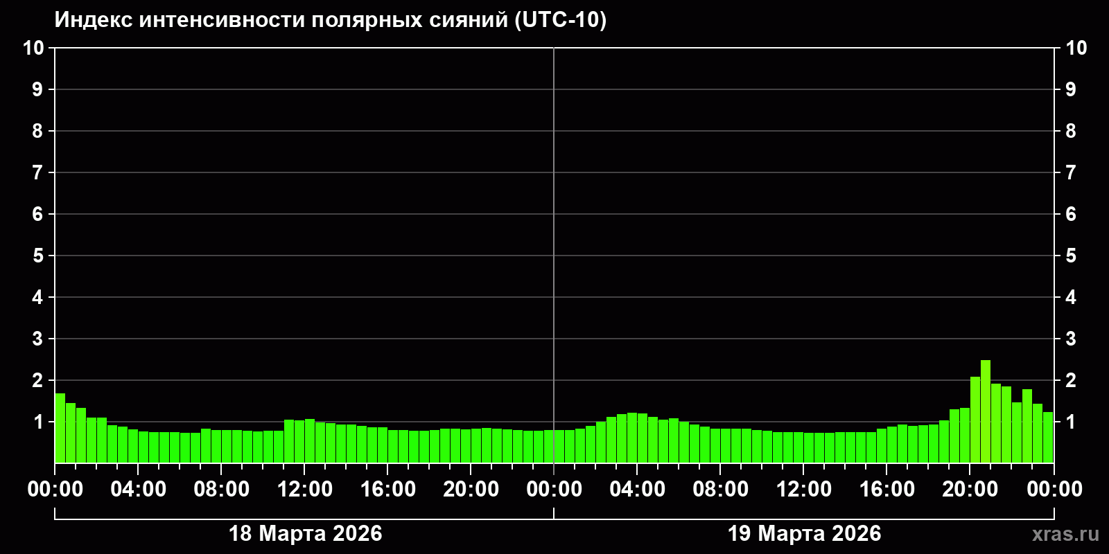 Изменения индекса интенсивности полярных сияний с 2026-03-18 по 2026-03-19 по местному времени