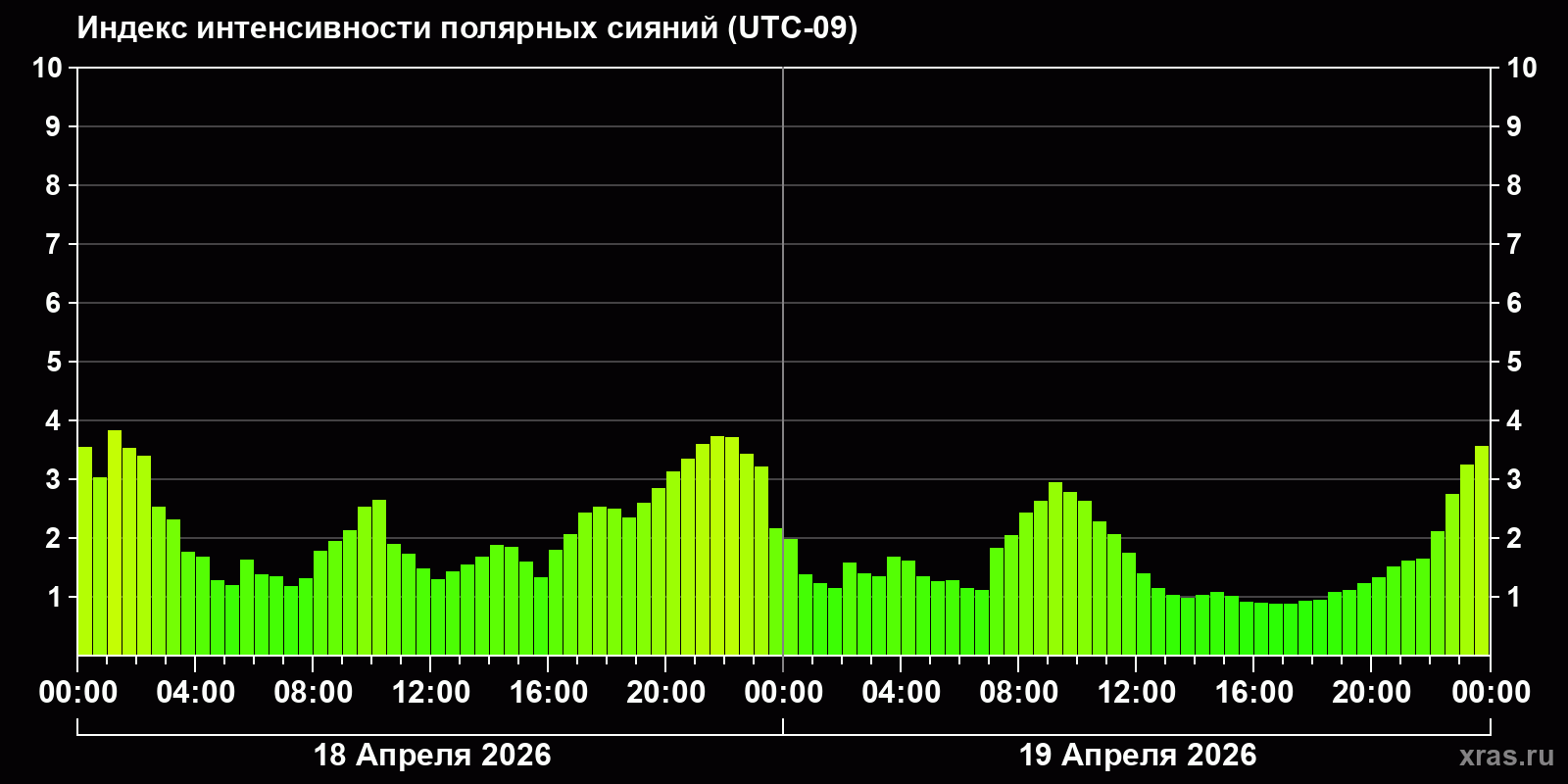 Изменения индекса интенсивности полярных сияний с 2026-04-18 по 2026-04-19 по местному времени