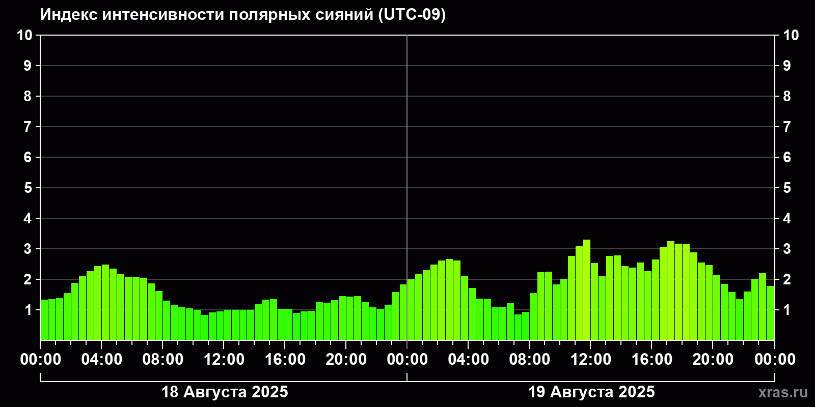 Изменения индекса интенсивности полярных сияний с 2025-08-18 по 2025-08-19 по местному времени