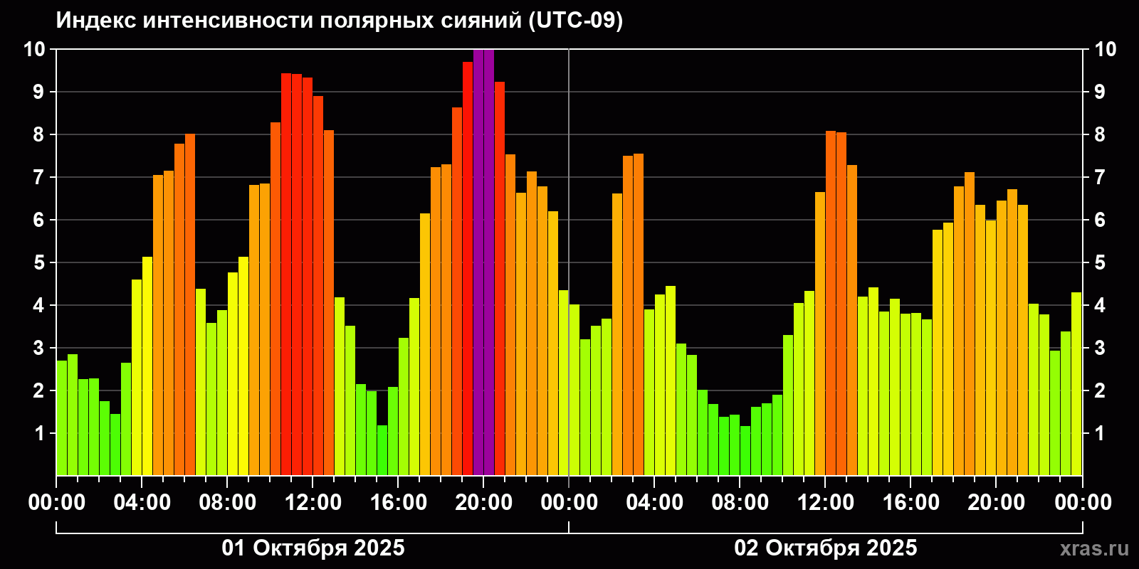 Изменения индекса интенсивности полярных сияний с 2025-10-01 по 2025-10-02 по местному времени