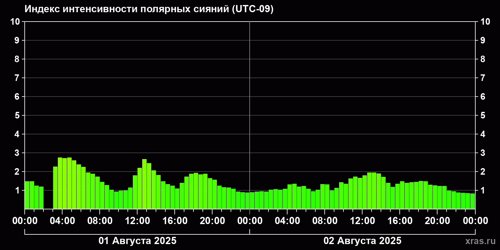 Изменения индекса интенсивности полярных сияний с 2025-08-01 по 2025-08-02 по местному времени