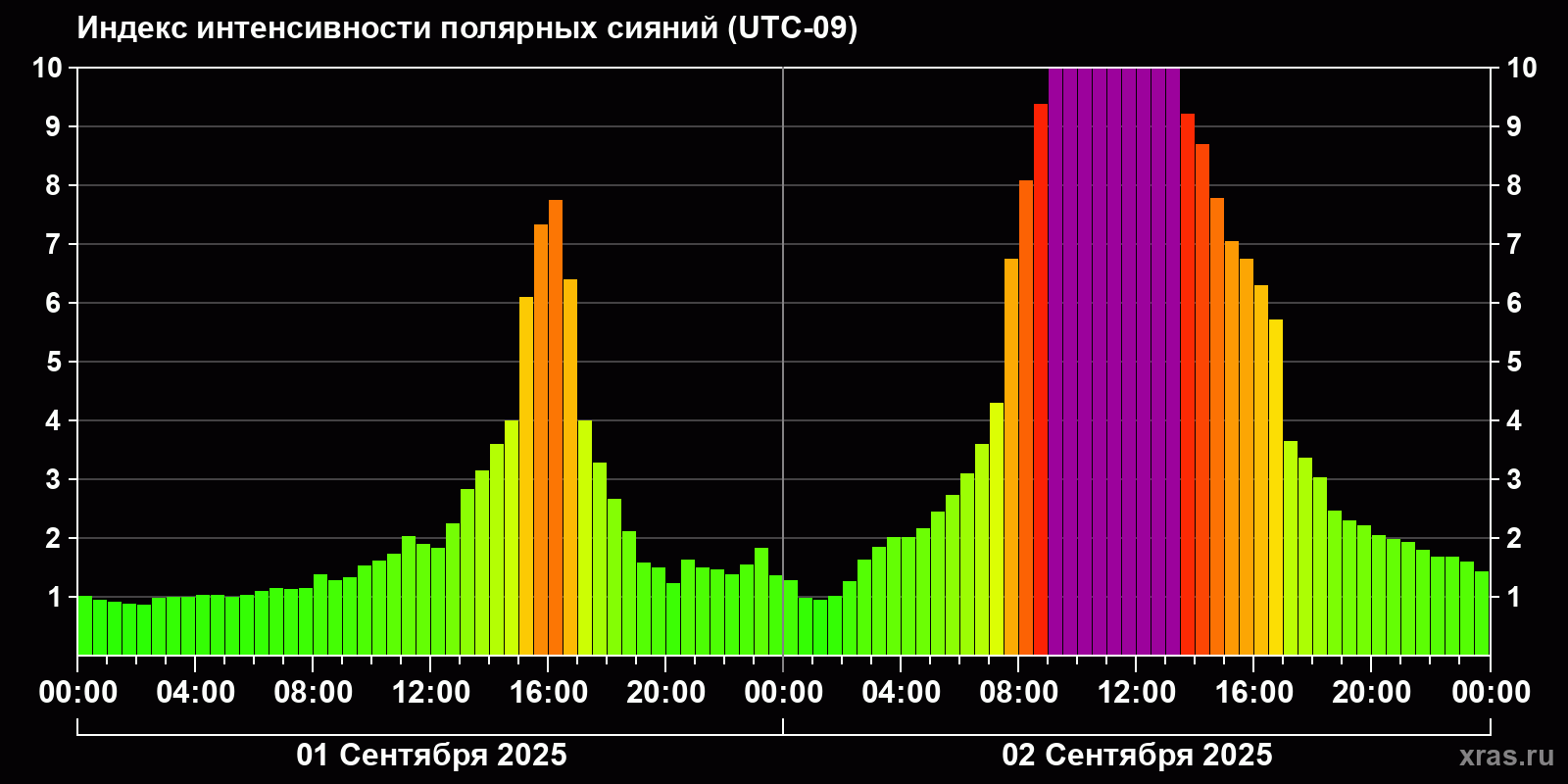 Изменения индекса интенсивности полярных сияний с 2025-09-01 по 2025-09-02 по местному времени