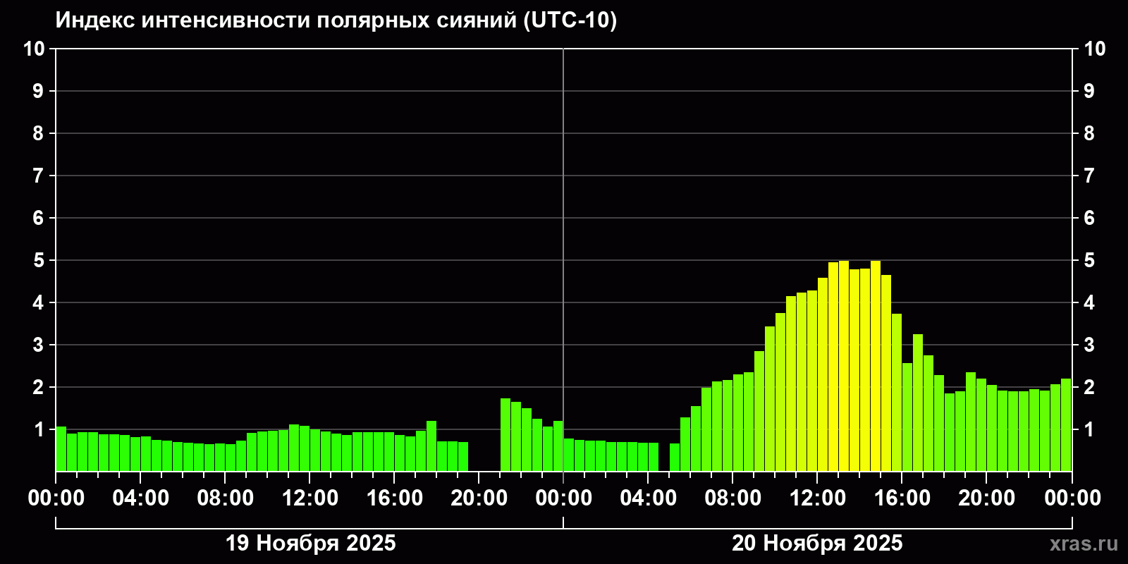 Изменения индекса интенсивности полярных сияний с 2025-11-19 по 2025-11-20 по местному времени