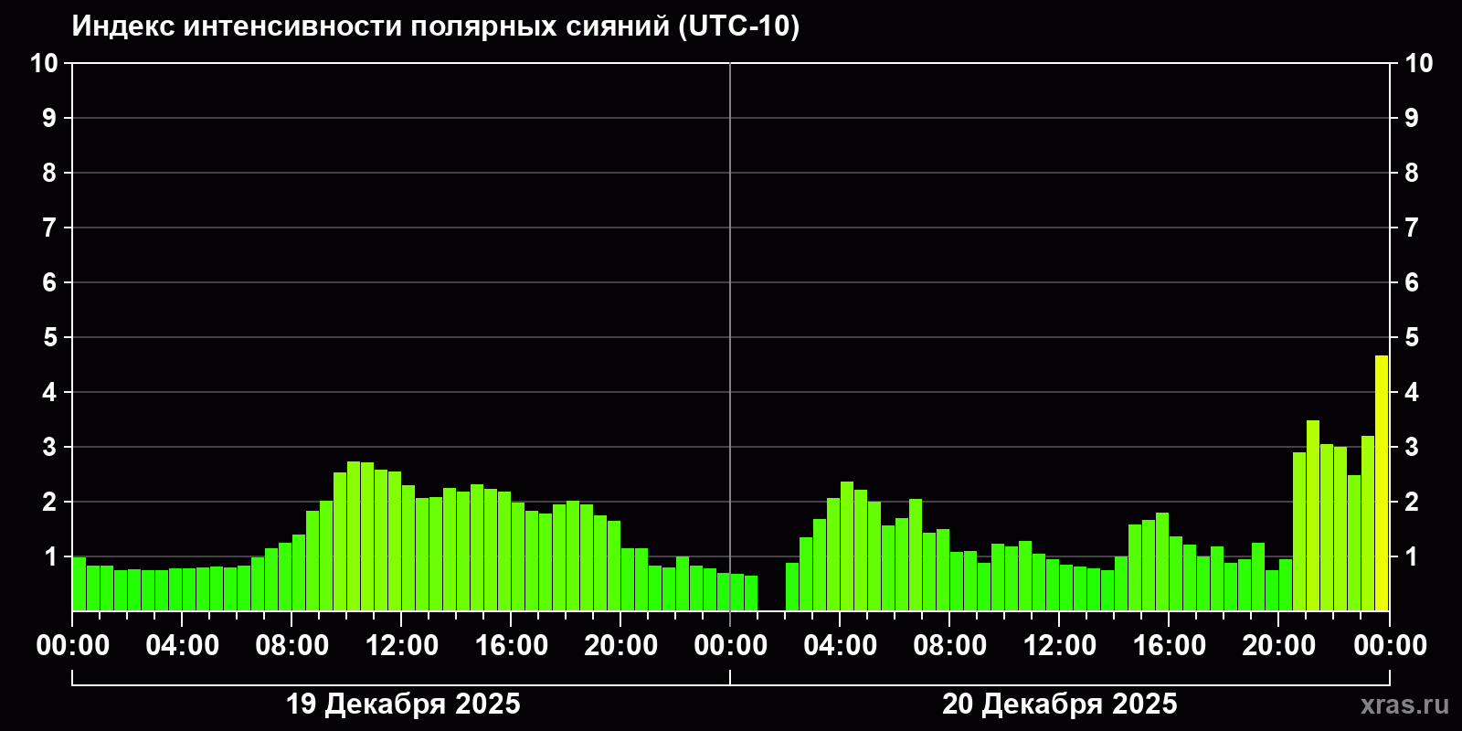Изменения индекса интенсивности полярных сияний с 2025-12-19 по 2025-12-20 по местному времени