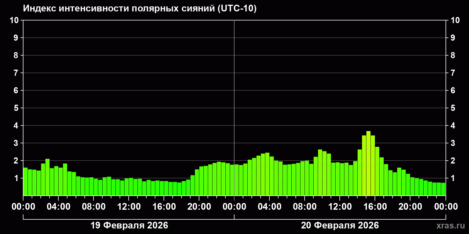 Изменения индекса интенсивности полярных сияний с 2026-02-19 по 2026-02-20 по местному времени