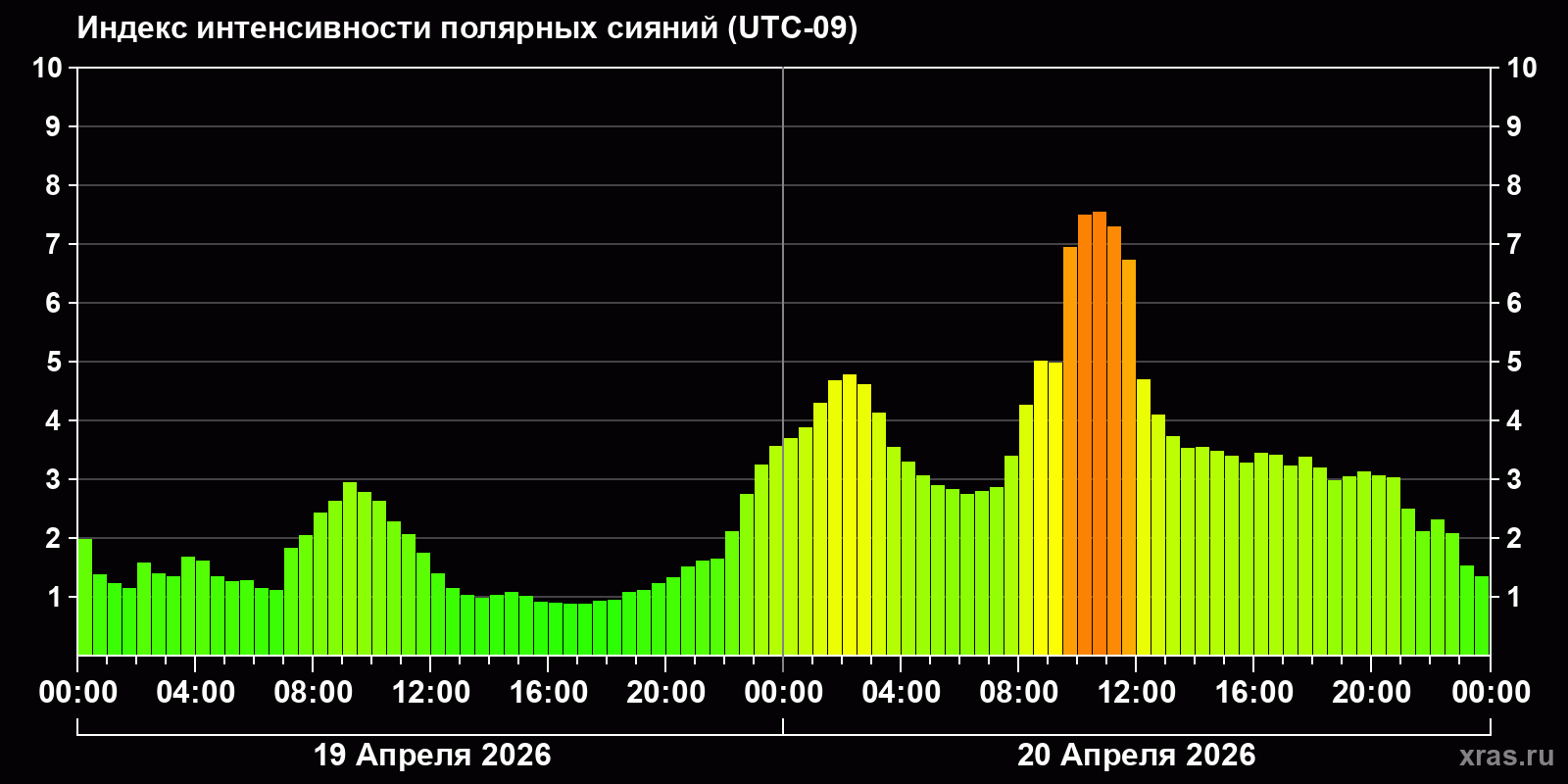 Изменения индекса интенсивности полярных сияний с 2026-04-19 по 2026-04-20 по местному времени
