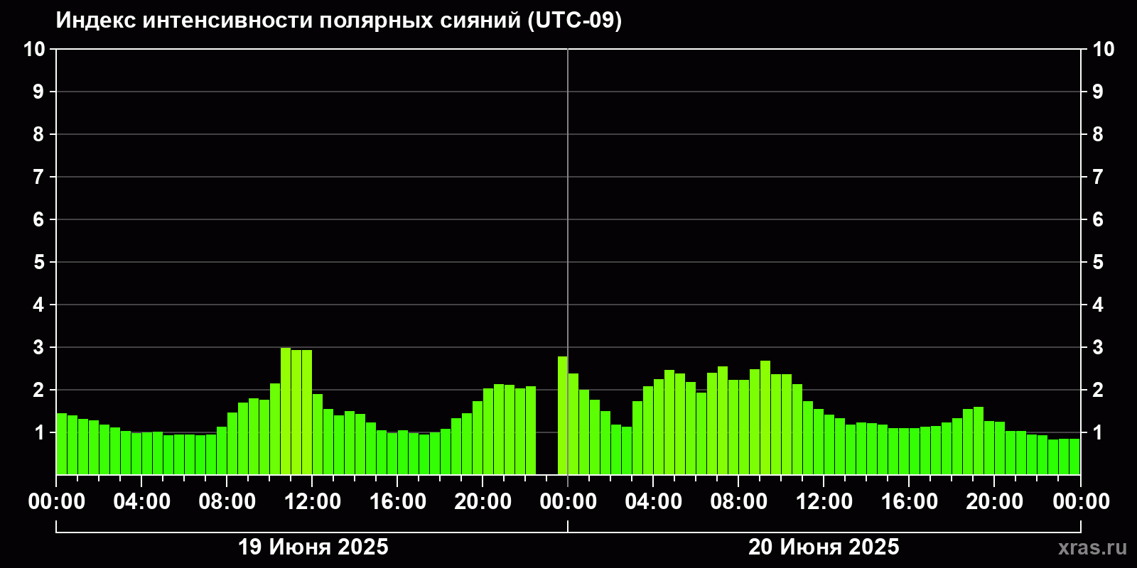 Изменения индекса интенсивности полярных сияний с 2025-06-19 по 2025-06-20 по местному времени
