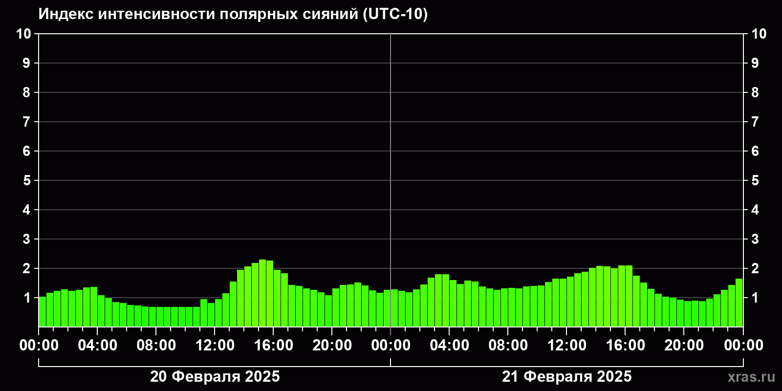 Изменения индекса интенсивности полярных сияний с 2025-02-20 по 2025-02-21 по местному времени
