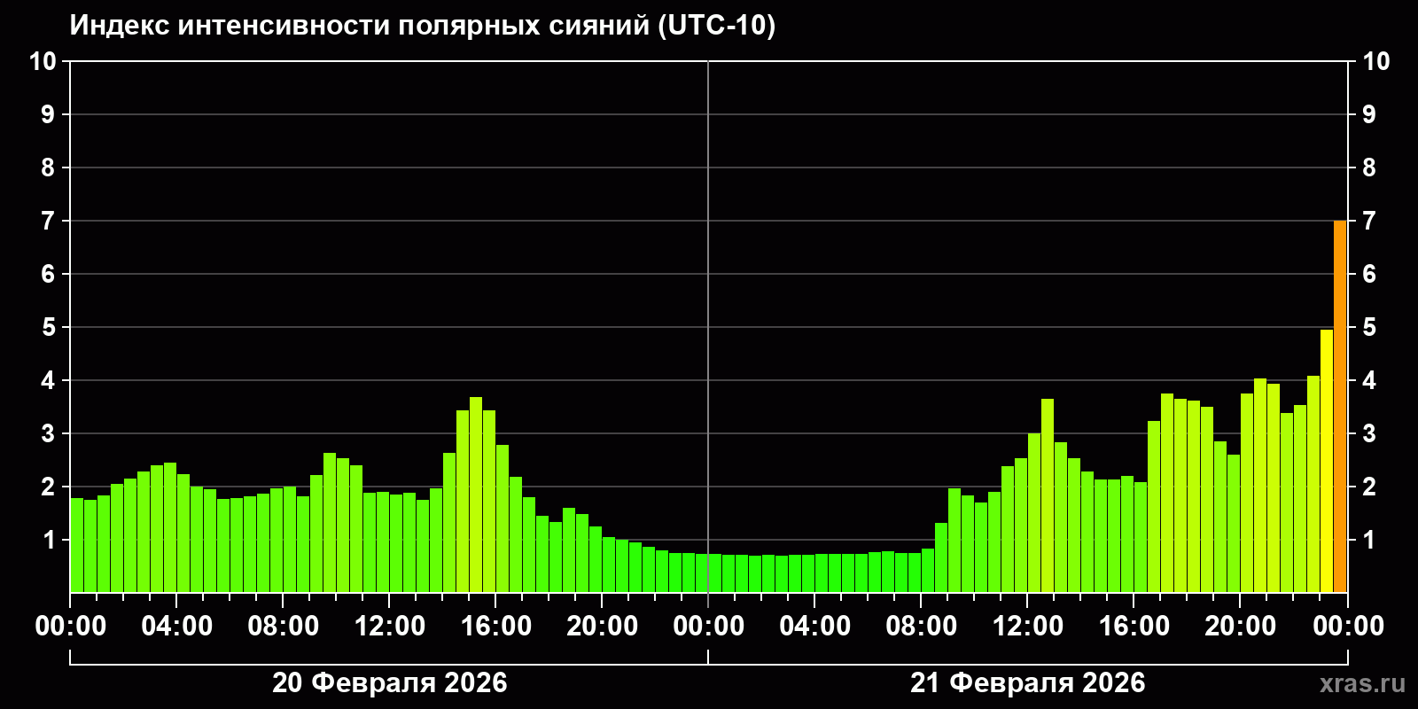 Изменения индекса интенсивности полярных сияний с 2026-02-20 по 2026-02-21 по местному времени