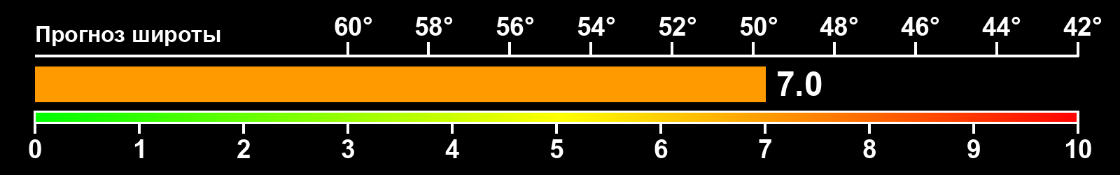 Индекс интенсивности полярных сияний и теоретически возможная широта наблюдений для ночного времени в западном полушарии по состоянию на 2026-02-21 23:46 (конец дня) по местному времени