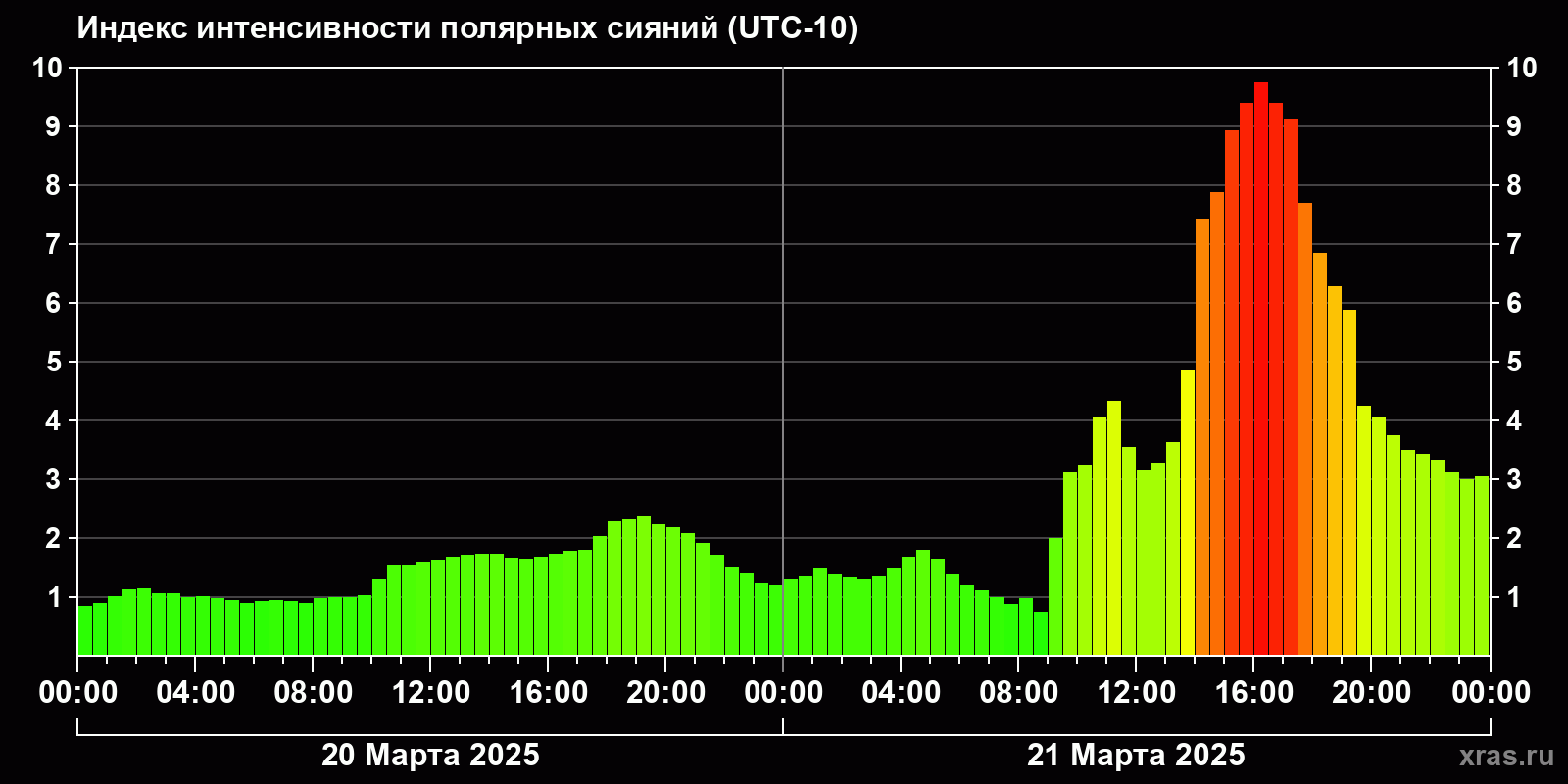 Изменения индекса интенсивности полярных сияний с 2025-03-20 по 2025-03-21 по местному времени