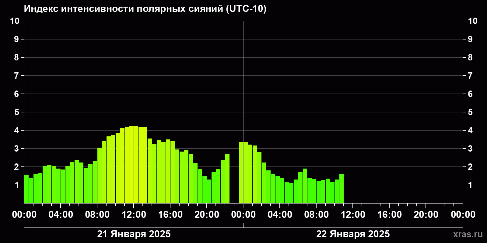 Изменения индекса интенсивности полярных сияний с 2025-01-21 по 2025-01-22 по местному времени