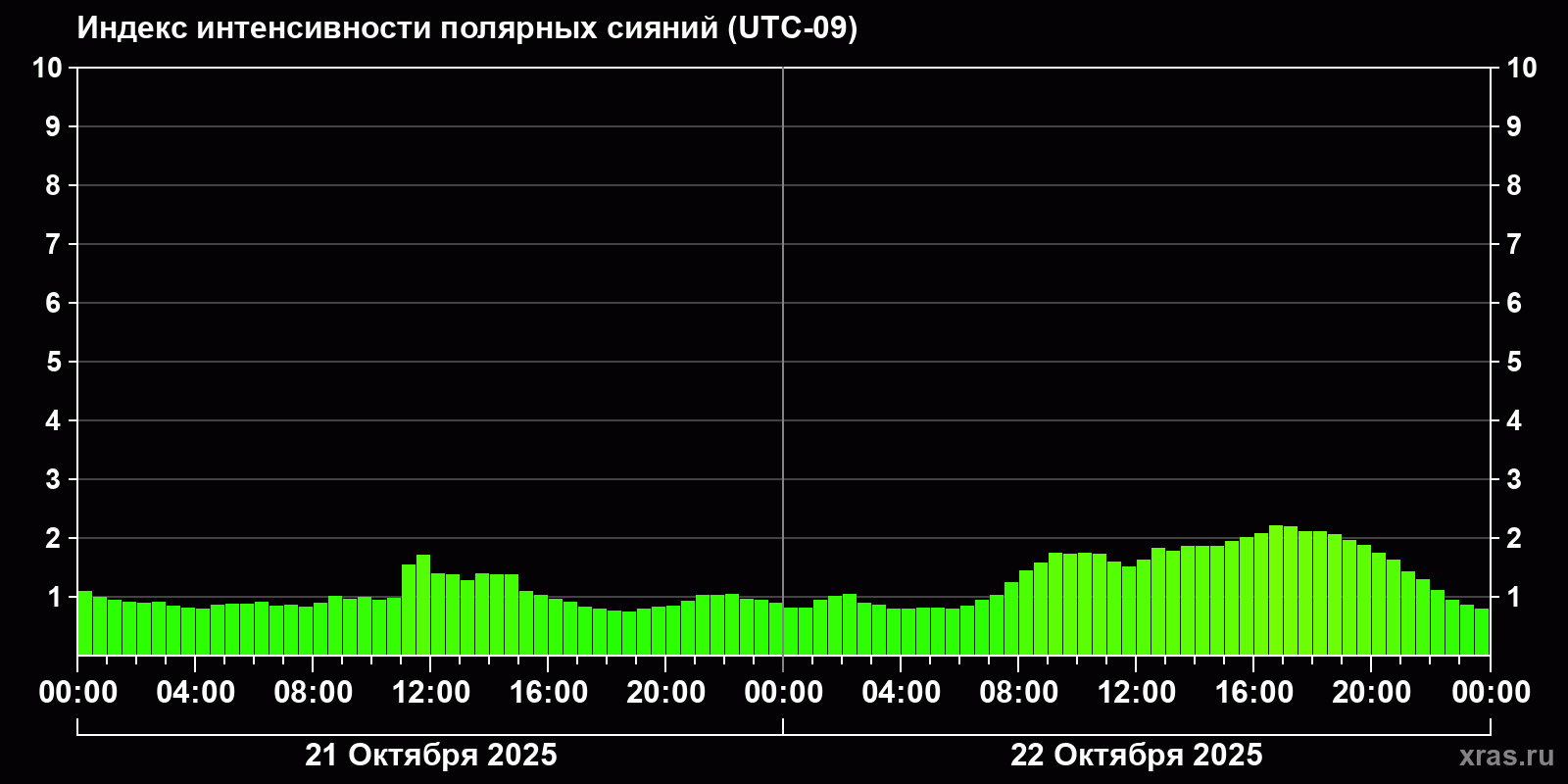 Изменения индекса интенсивности полярных сияний с 2025-10-21 по 2025-10-22 по местному времени
