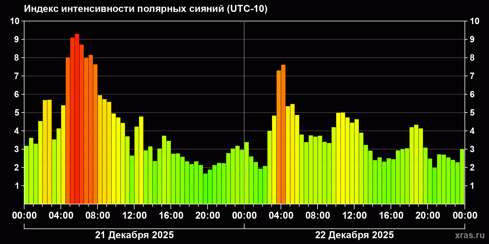 Изменения индекса интенсивности полярных сияний с 2025-12-21 по 2025-12-22 по местному времени