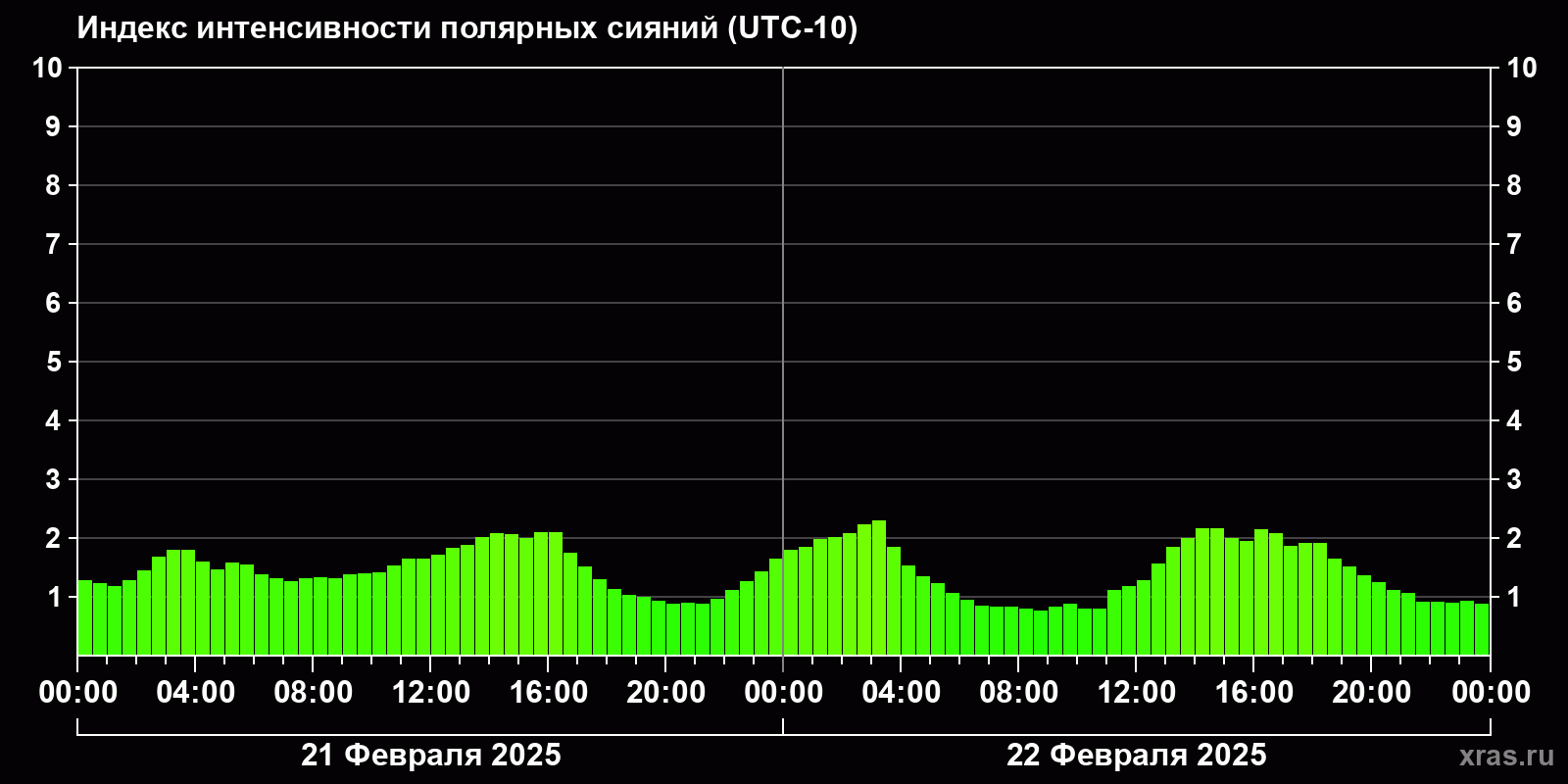 Изменения индекса интенсивности полярных сияний с 2025-02-21 по 2025-02-22 по местному времени