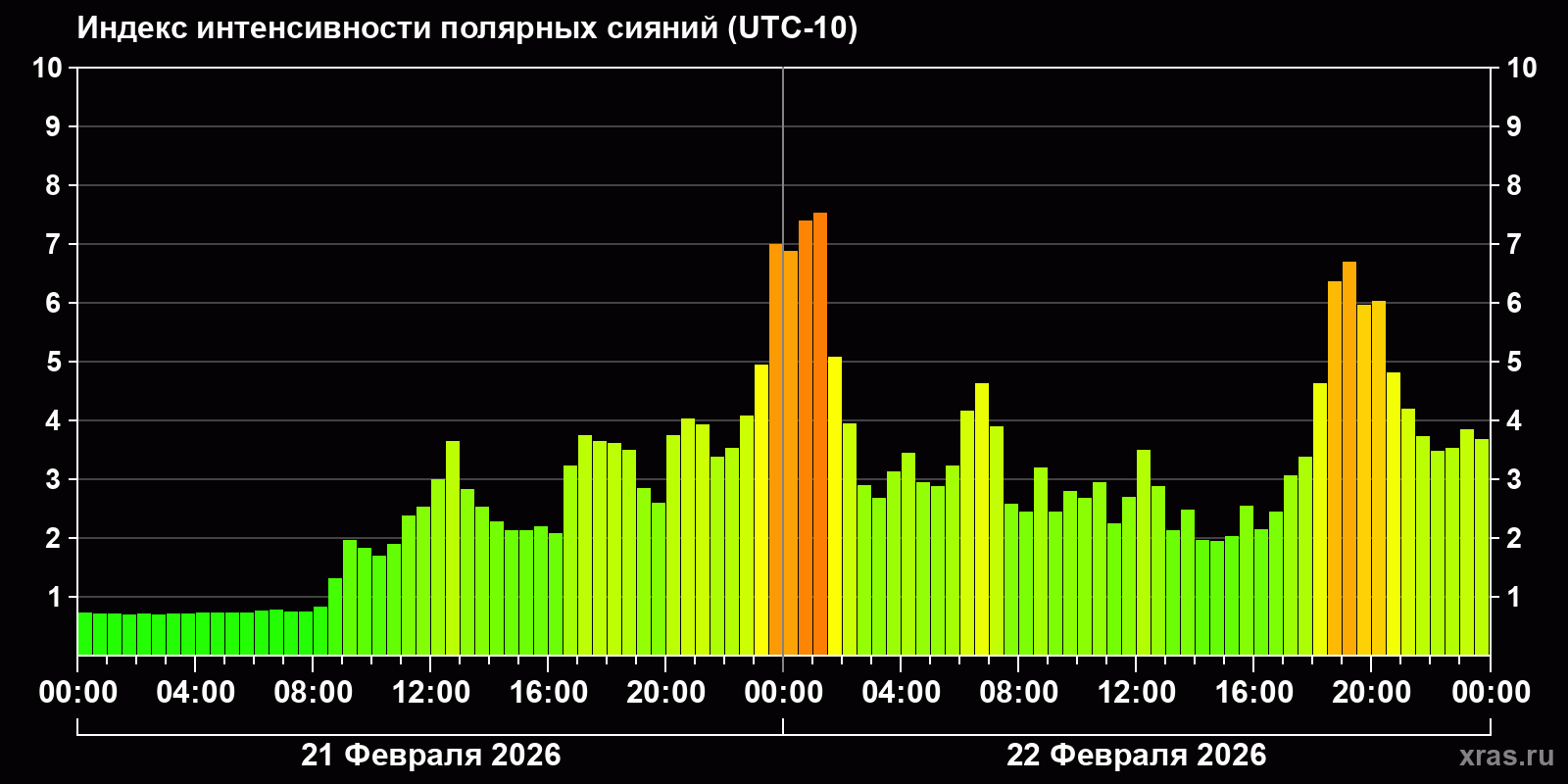 Изменения индекса интенсивности полярных сияний с 2026-02-21 по 2026-02-22 по местному времени