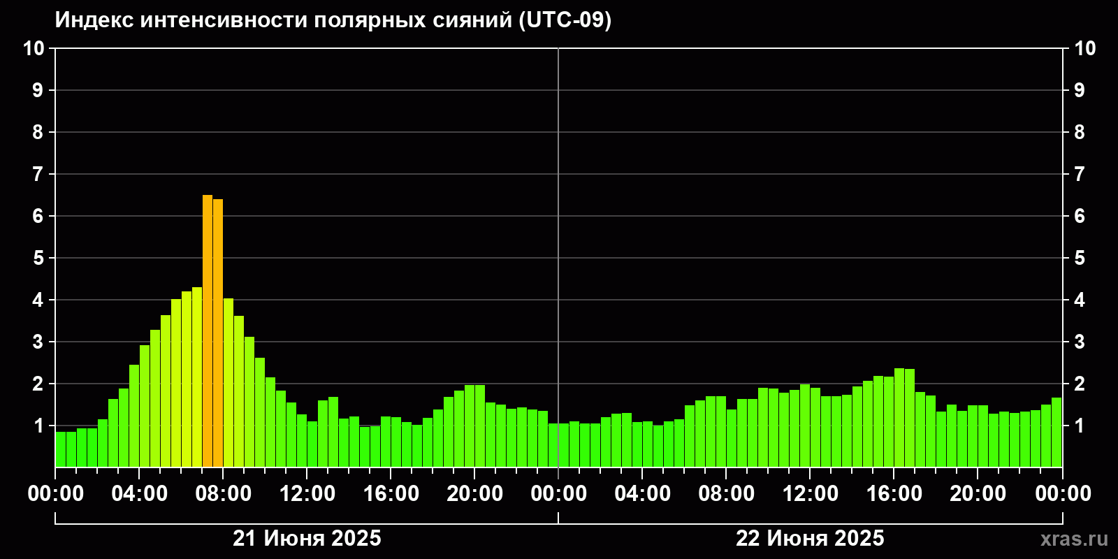 Изменения индекса интенсивности полярных сияний с 2025-06-21 по 2025-06-22 по местному времени