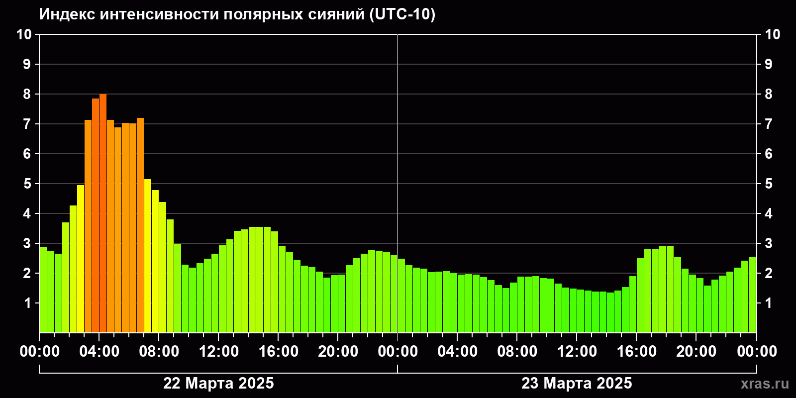 Изменения индекса интенсивности полярных сияний с 2025-03-22 по 2025-03-23 по местному времени