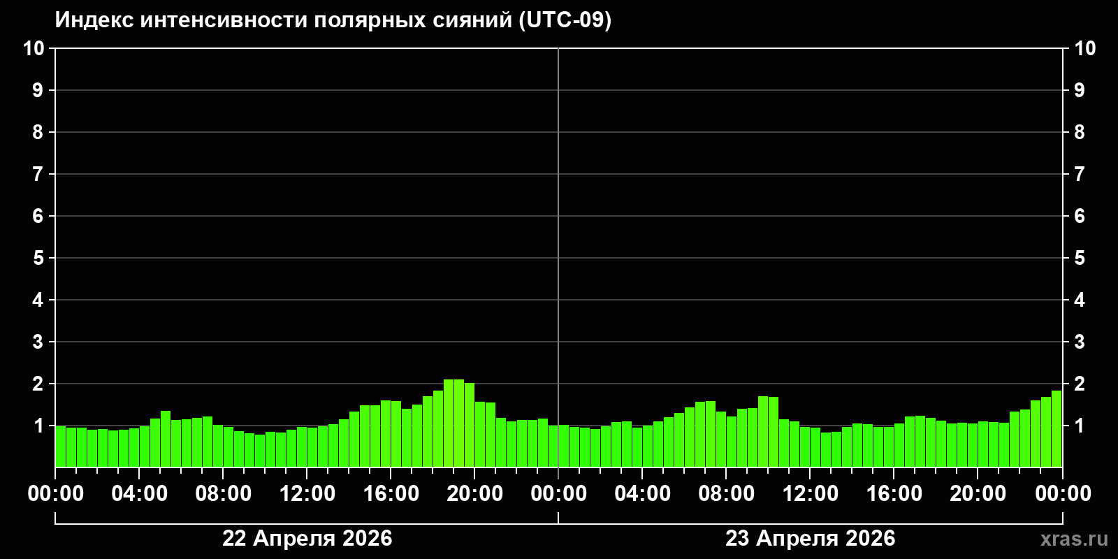 Изменения индекса интенсивности полярных сияний с 2026-04-22 по 2026-04-23 по местному времени