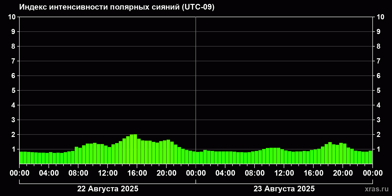 Изменения индекса интенсивности полярных сияний с 2025-08-22 по 2025-08-23 по местному времени