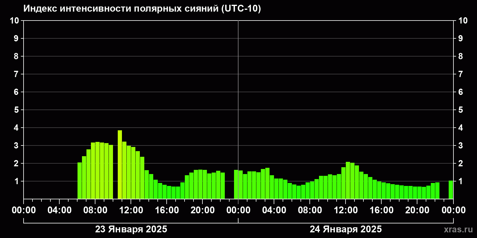 Изменения индекса интенсивности полярных сияний с 2025-01-23 по 2025-01-24 по местному времени