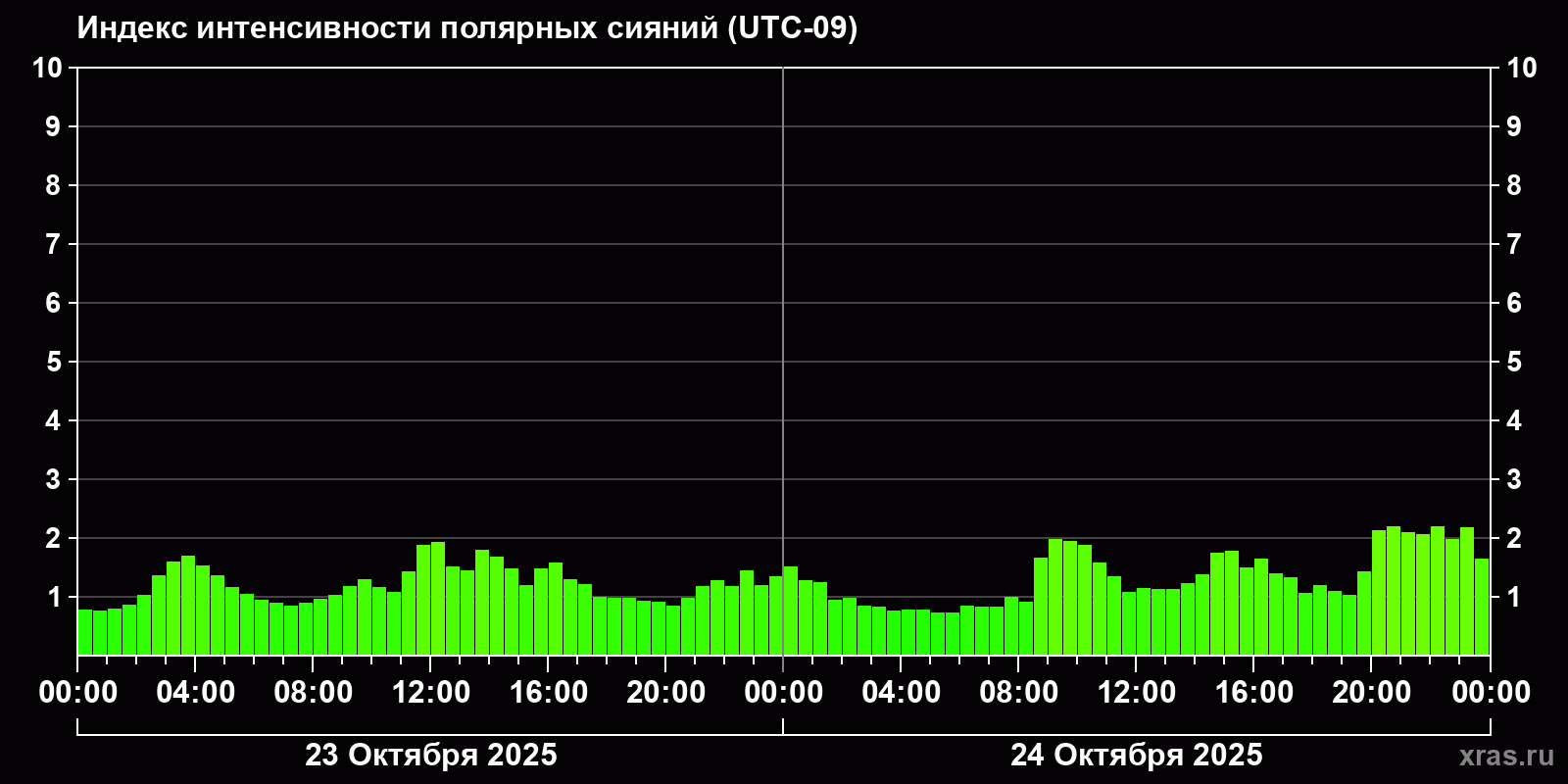 Изменения индекса интенсивности полярных сияний с 2025-10-23 по 2025-10-24 по местному времени