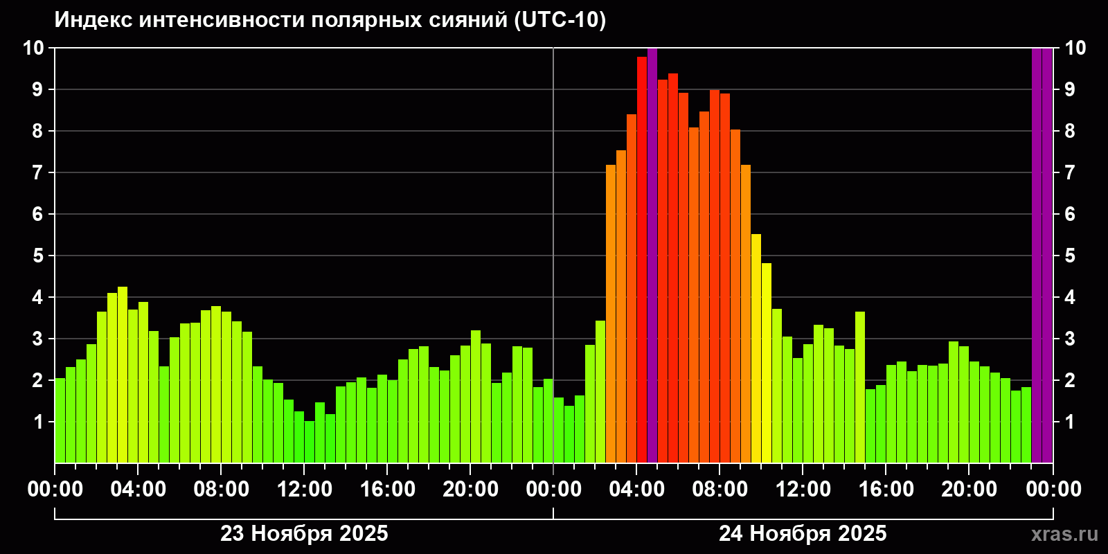 Изменения индекса интенсивности полярных сияний с 2025-11-23 по 2025-11-24 по местному времени